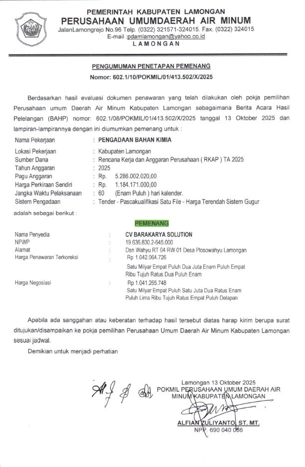 DIUMUMKAN LELANG/TENDER PENGADAAN BAHAN KIMIA DI PERUMDA AIR MINUM KABUPATEN LAMONGAN TAHUN ANGGARAN 2025