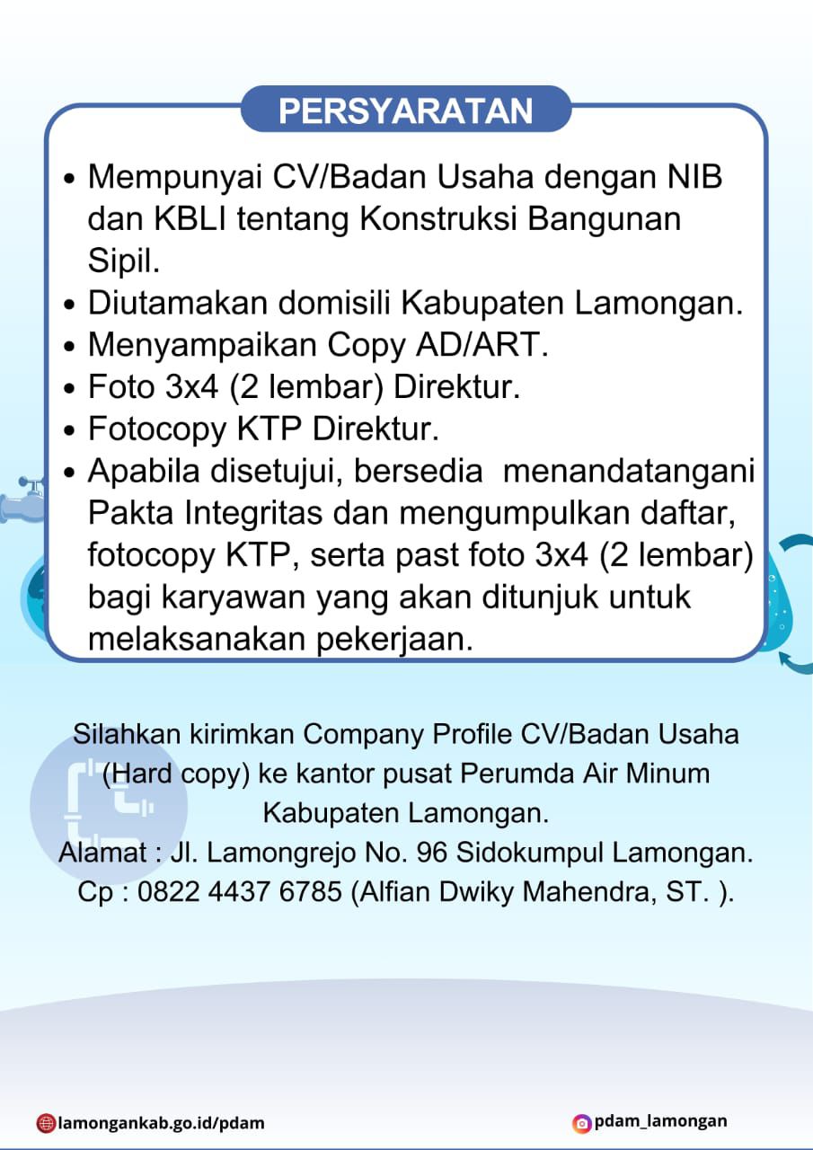 Perumda Air Minum Kabupaten Lamongan membuka pendaftaran calon penyedia untuk pekerjaan pemasangan pipa distribusi/tersier.