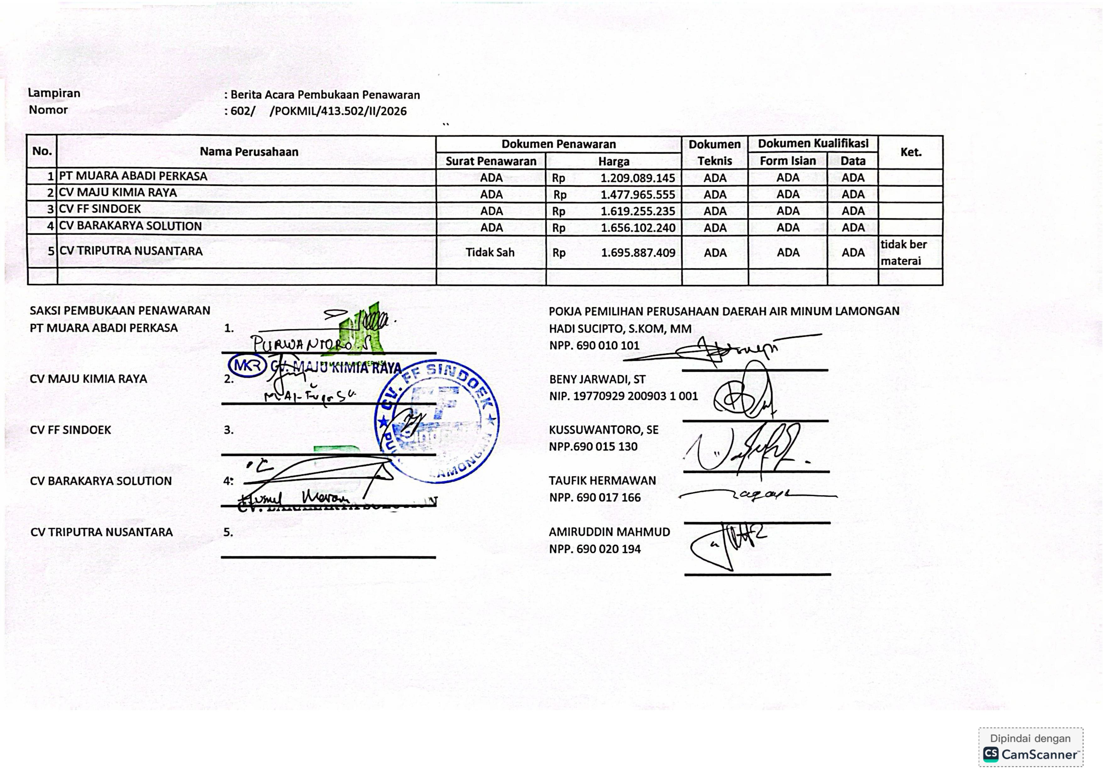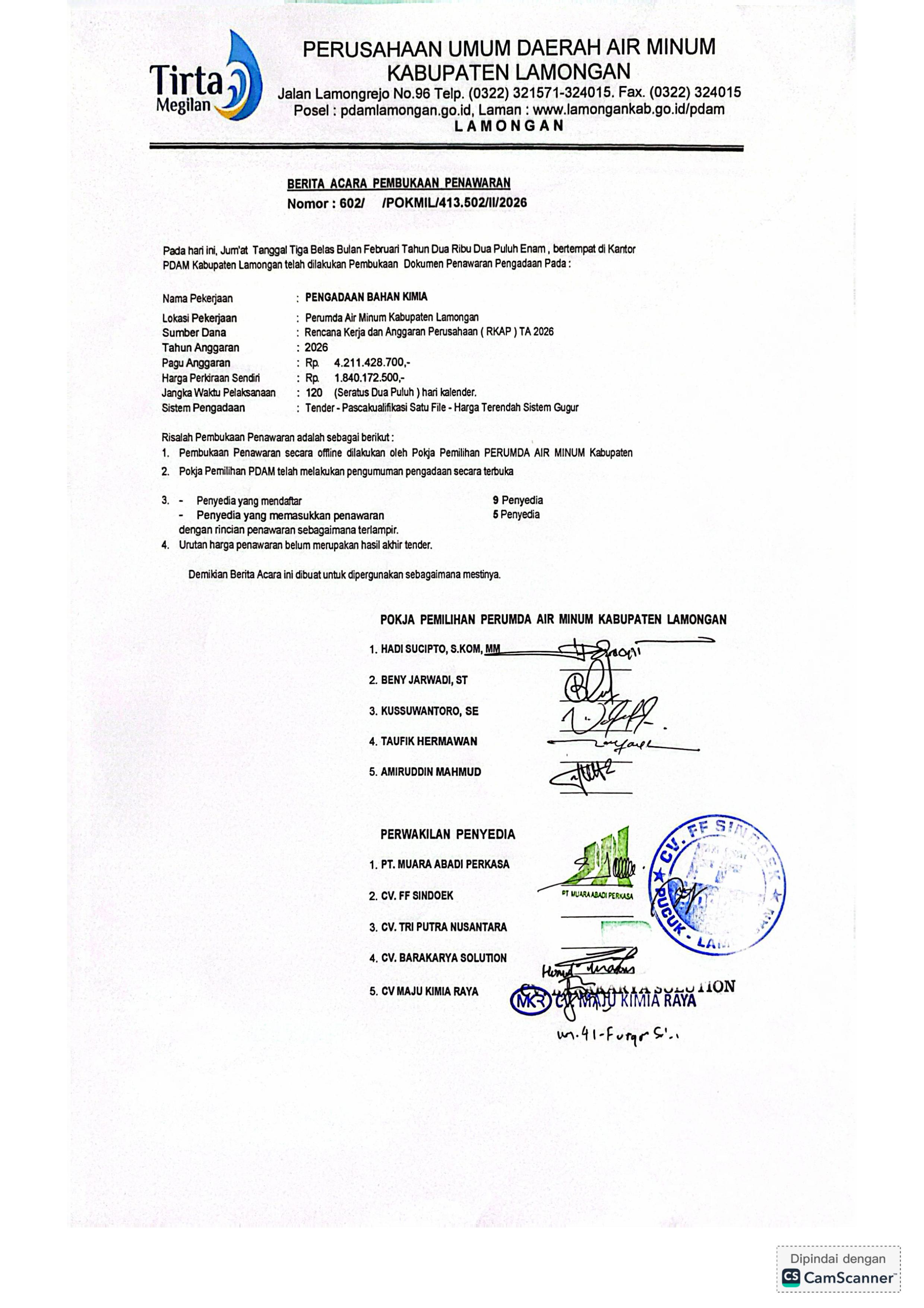 Diumumkan Hasil Pelelangan (BAHP) Pengadaan bahan Kimia Pada Perusahaan Umum Daerah Air Minum Kabupaten Lamongan Tahun Anggaran 2026