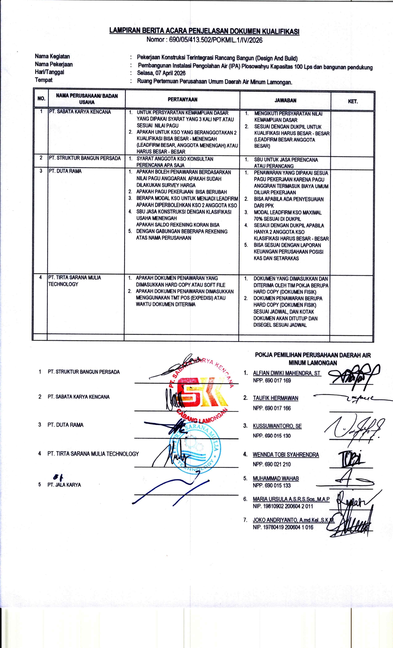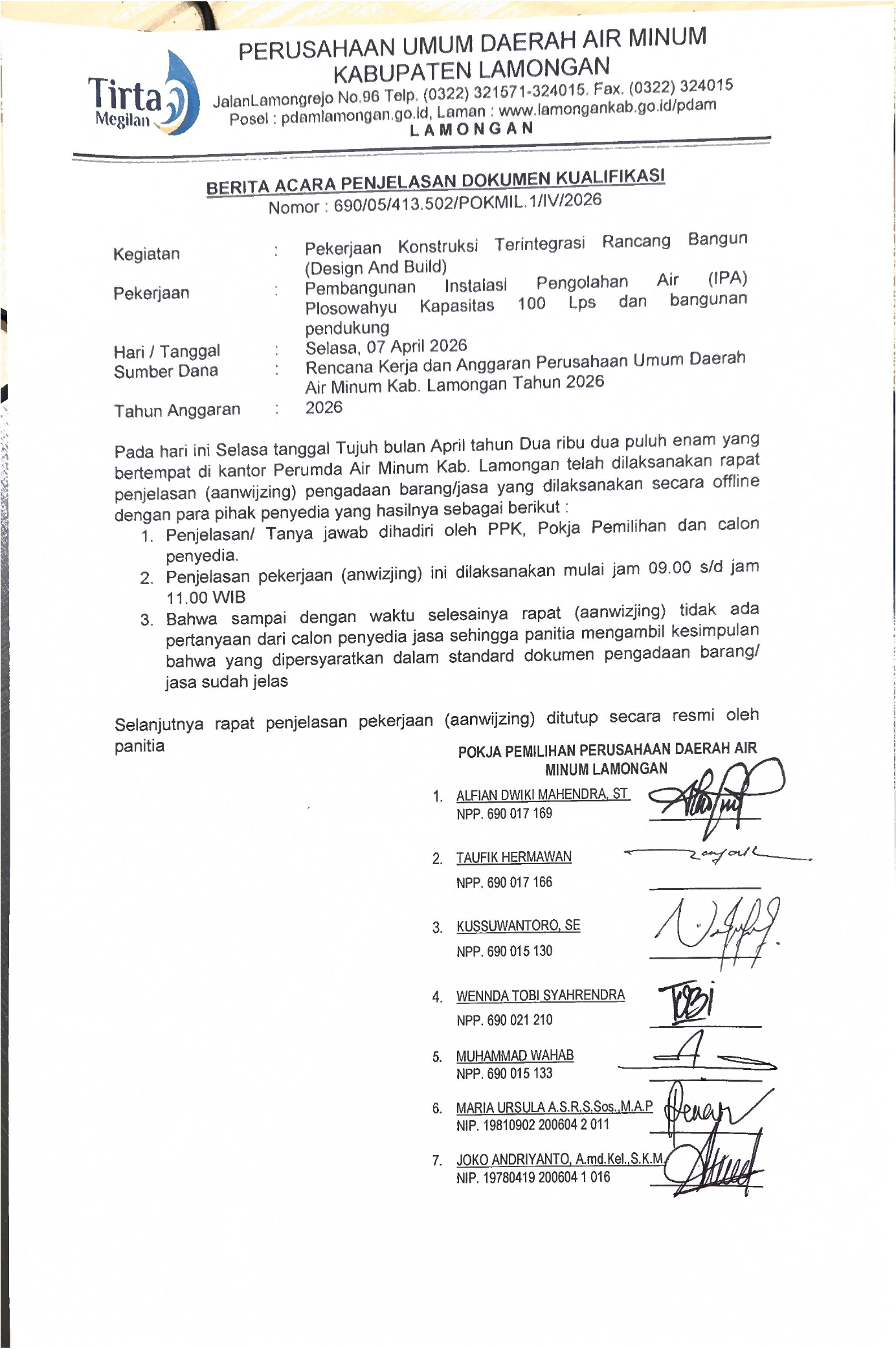 BERITA ACARA PENJELASAN DOKUMEN KUALIFIKASI PENGADAAN PEKERJAAN KONSTRUKSI TERINTEGRASI RANCANG DAN BANGUN PEMBANGUNAN IPA KAPASITAS 100 LPS DAN BANGUNAN PENDUKUNG UNTUK MENDUKUNG SPAM PLOSOWAHYU PERUMDA AIR MINUM KABUPATEN LAMONGAN TAHUN 2026