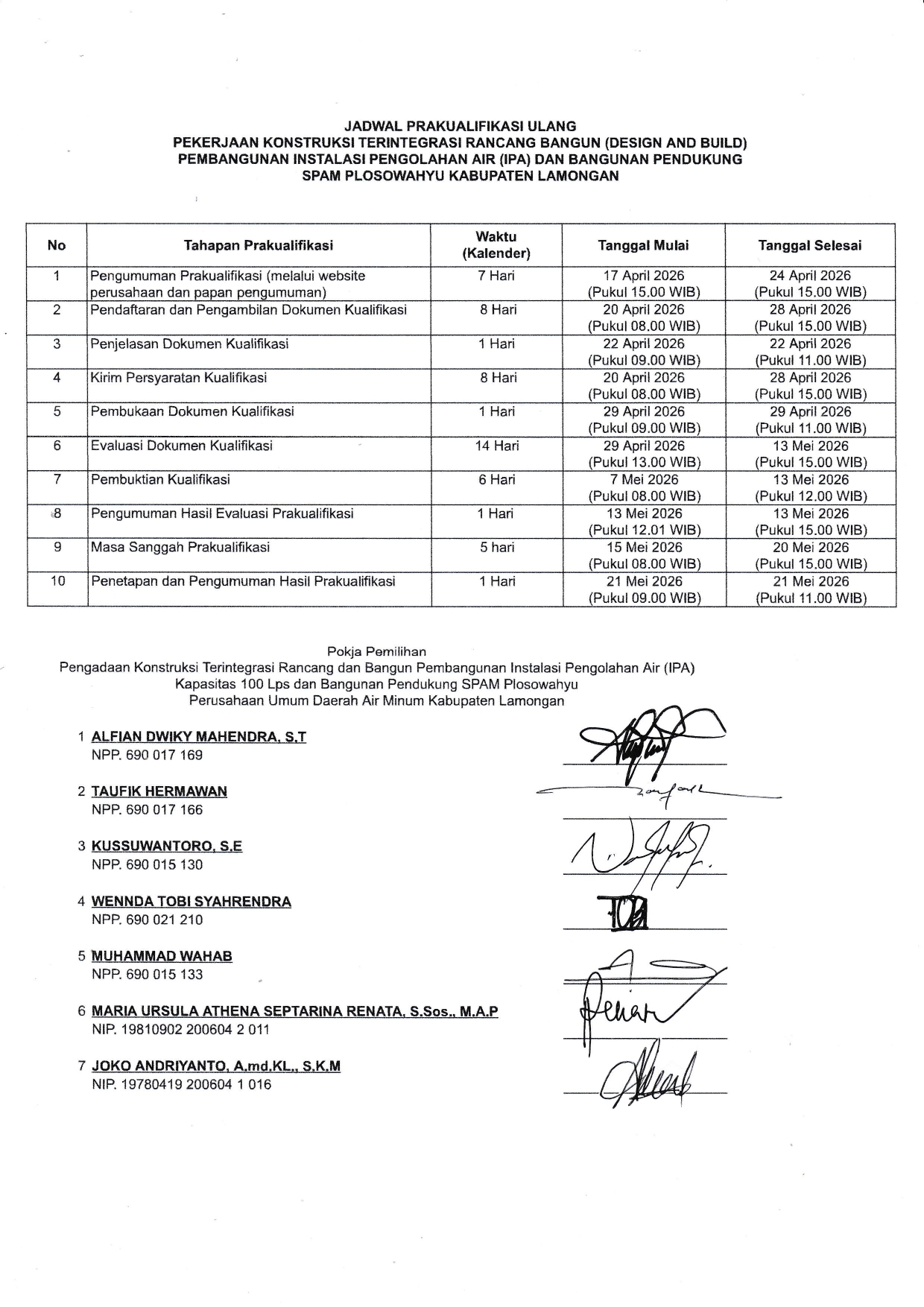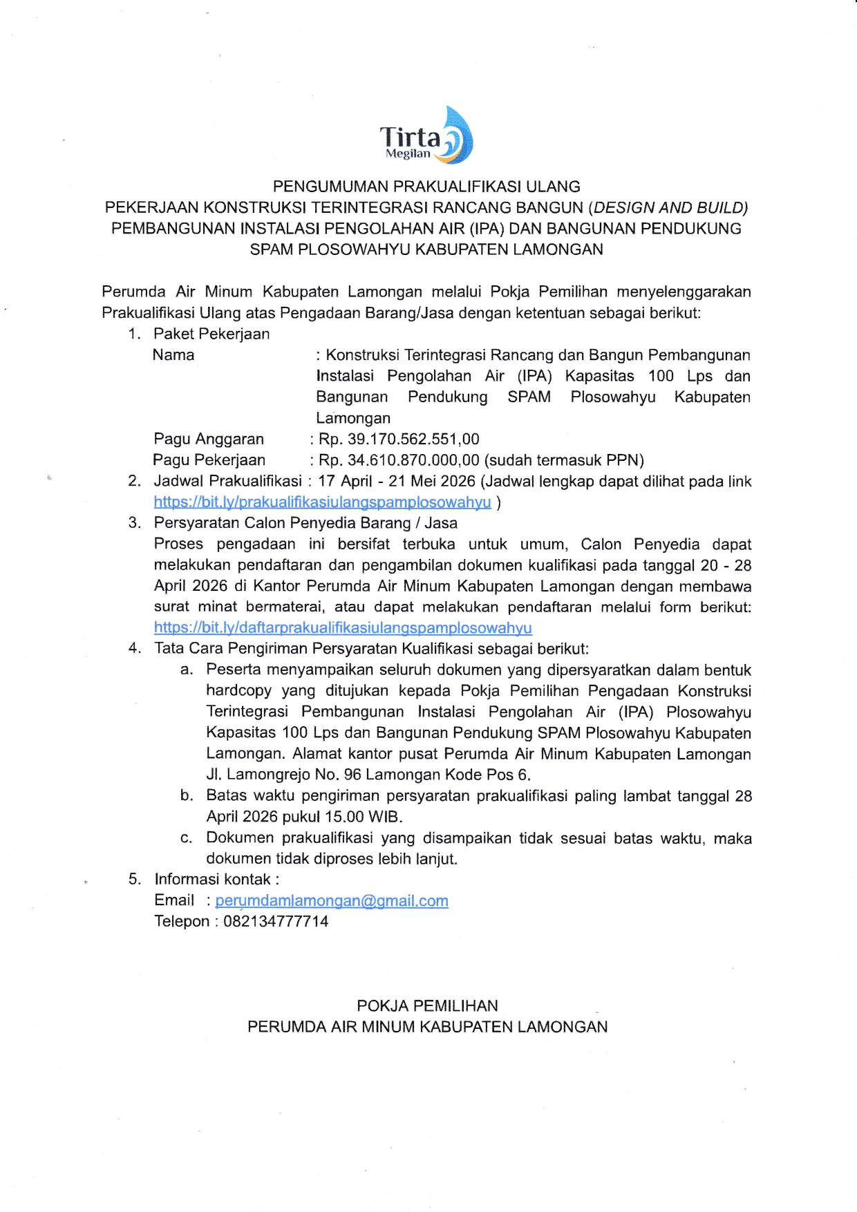 Informasi • 07 April 2026 BERITA ACARA PENJELASAN DOKUMEN KUALIFIKASI PENGADAAN PEKERJAAN KONSTRUKSI TERINTEGRASI RANCANG DAN BANGUN PEMBANGUNAN IPA KAPASITAS 100 LPS DAN BANGUNAN PENDUKUNG UNTUK MENDUKUNG SPAM PLOSOWAHYU PERUMDA AIR MINUM KABUPATEN LAMONGAN TAHUN 2026