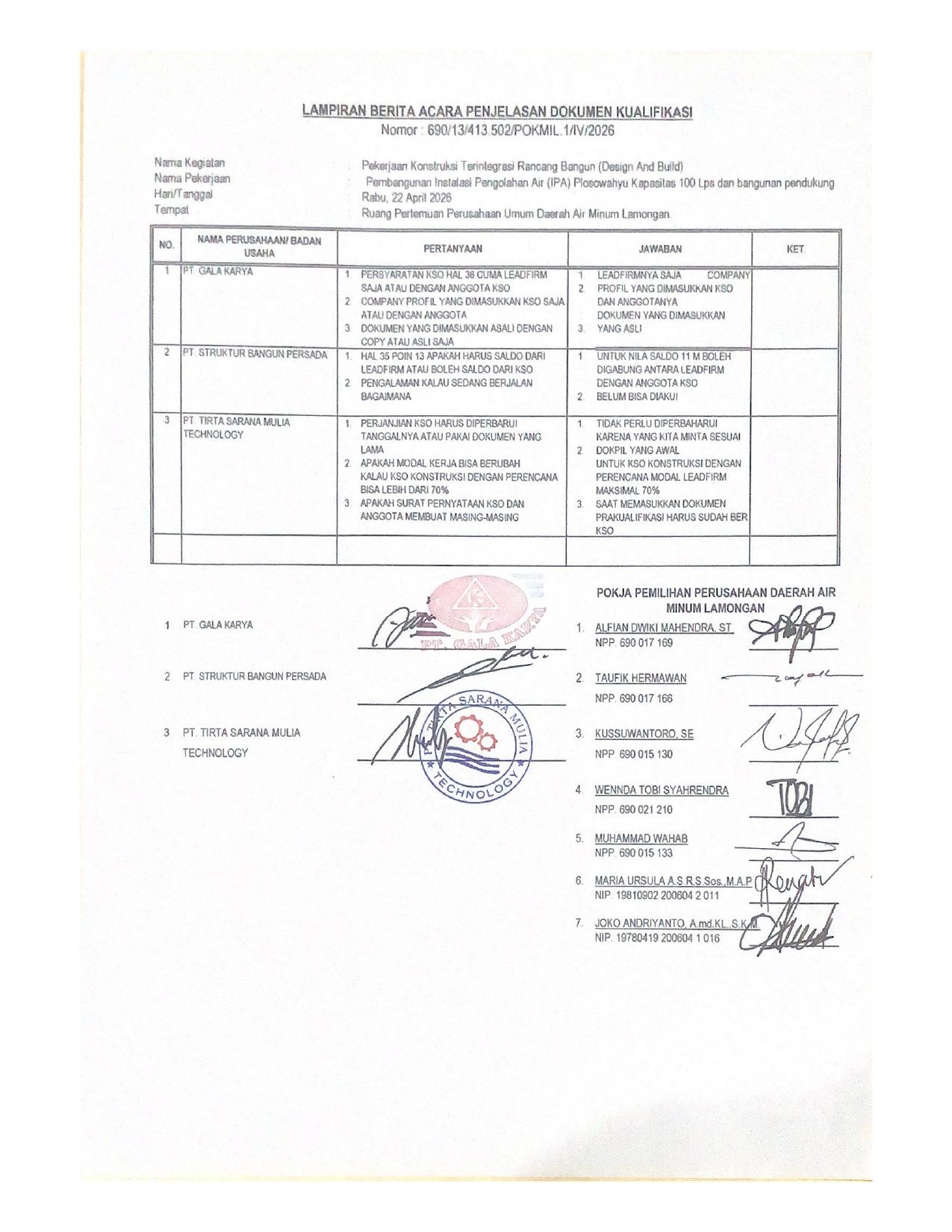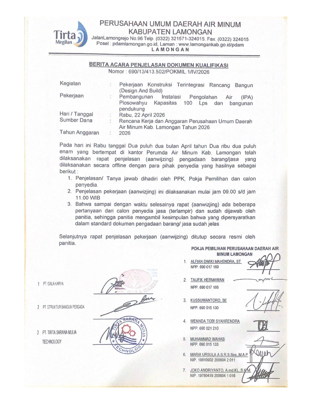 Informasi • 07 April 2026 BERITA ACARA PENJELASAN DOKUMEN KUALIFIKASI PENGADAAN PEKERJAAN KONSTRUKSI TERINTEGRASI RANCANG DAN BANGUN PEMBANGUNAN IPA KAPASITAS 100 LPS DAN BANGUNAN PENDUKUNG UNTUK MENDUKUNG SPAM PLOSOWAHYU PERUMDA AIR MINUM KABUPATEN LAMONGAN TAHUN 2026